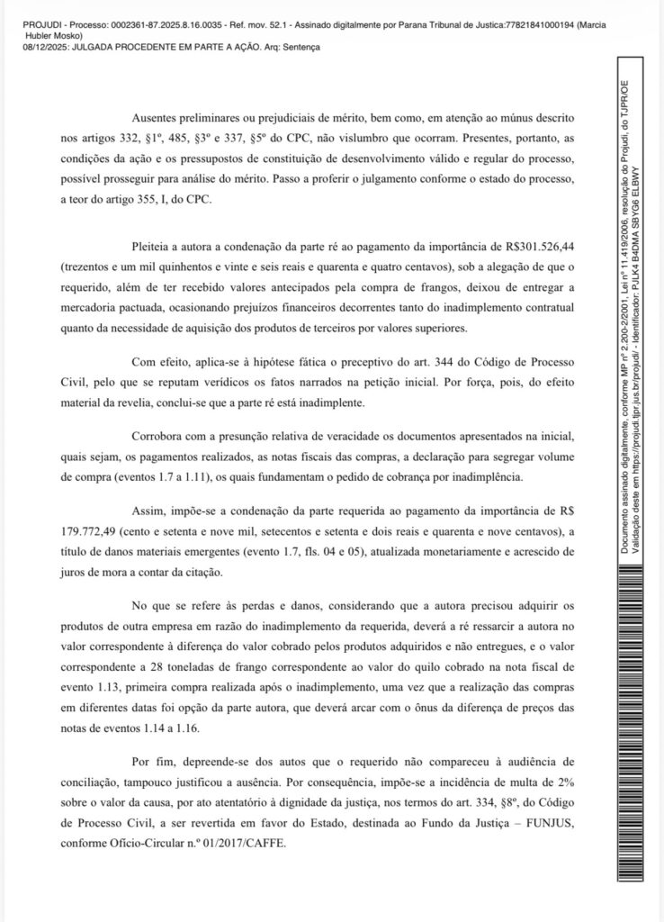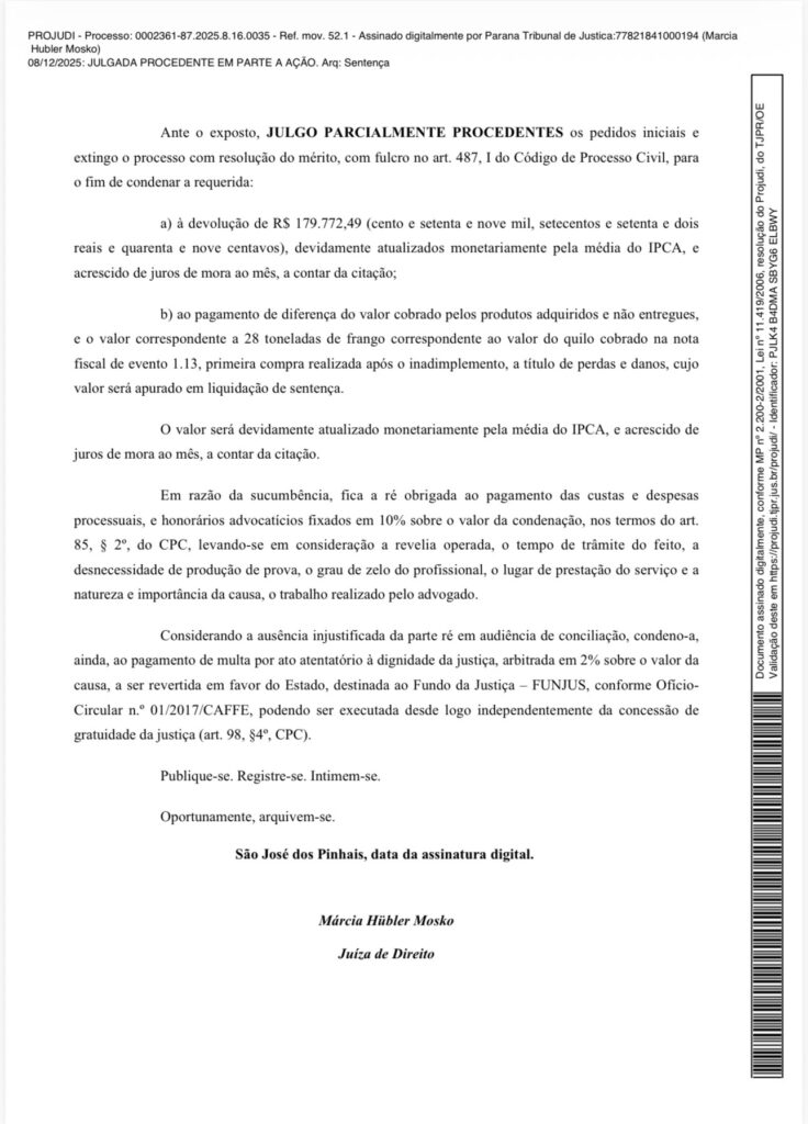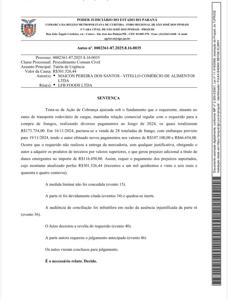 A situação de Daniel Coelho se complicou ainda mais com a divulgação, pela IBTV, de uma sentença judicial envolvendo a empresa LFB Foods Ltda., registrada em nome da diarista que denunciou o caso. Nos autos do processo nº 0002361-87.2025.8.16.0035, a Justiça do Paraná determinou que a empresa fosse condenada por receber dezenas de pagamentos antecipados e não entregar 28 toneladas de frango ao comprador, mesmo após valores significativos terem sido repassados.