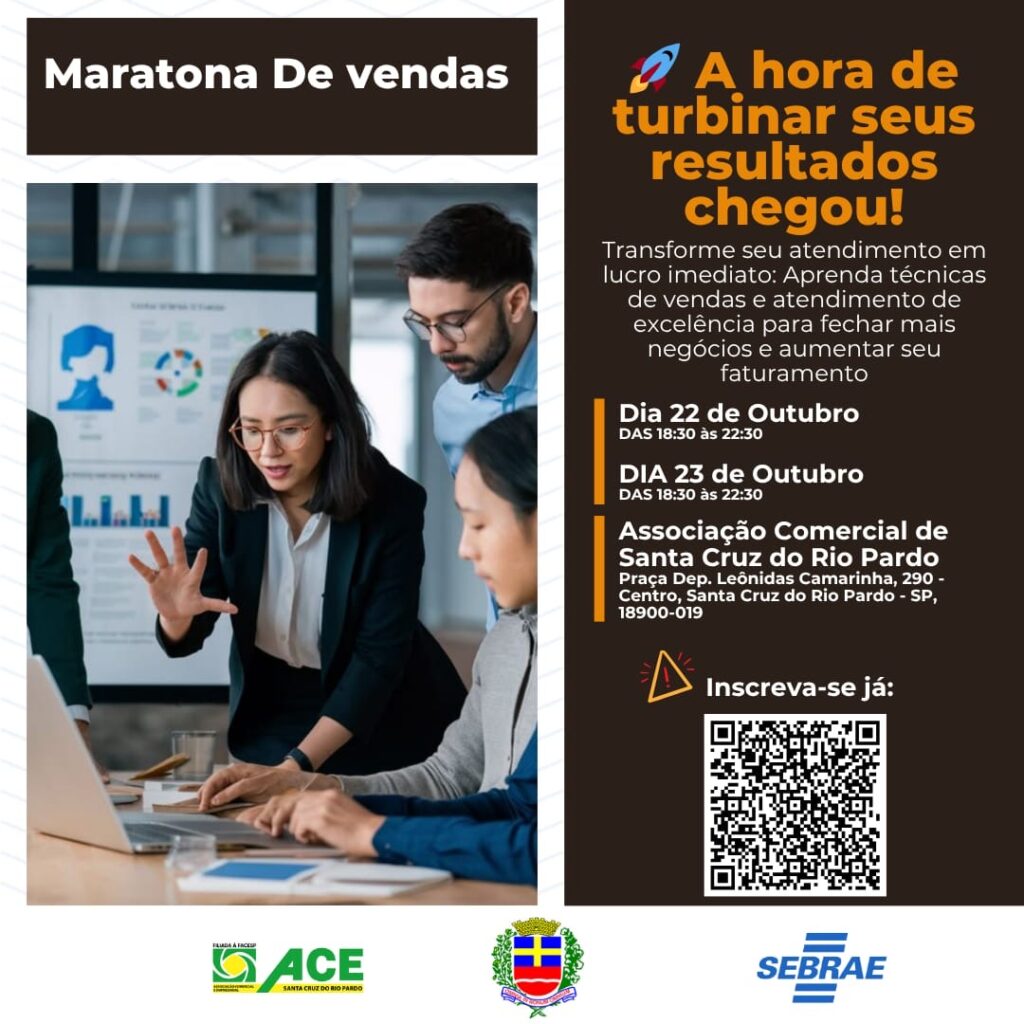 Nos dias 22 e 23 de outubro, o Sebrae-SP realiza o evento “Maratona de Vendas”, em Santa Cruz do Rio Pardo, com oficinas práticas para empreendedores que queiram turbinar suas vendas e conquistar novos clientes. As capacitações ocorrem a partir das 18h30 na Associação Comercial de Santa Cruz do Rio Pardo (Praça Dep. Leônidas Camarinha, 290 – Centro).