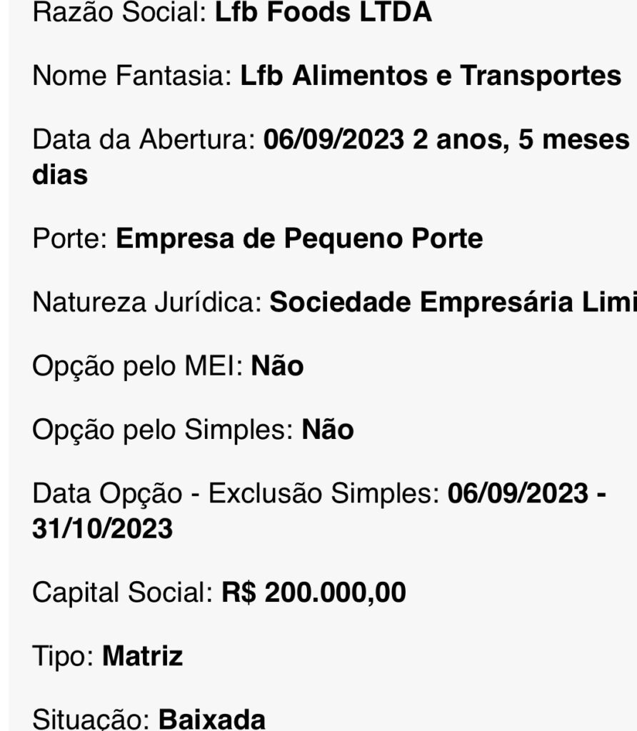 A empresa teria sido constituída no ramo de comércio e transporte de alimentos e animais, com endereço na cidade de Assis (SP). Conforme dados obtidos em consulta pública, uma das empresas registradas é a LFB Foods Ltda, nome fantasia LFB Alimentos e Transportes, fundada em 6 de setembro de 2023, com capital social de R$ 200 mil, enquadrada como empresa de pequeno porte e atualmente com situação cadastral baixada, após encerramento por liquidação voluntária. A sede também consta no município de Assis (SP).